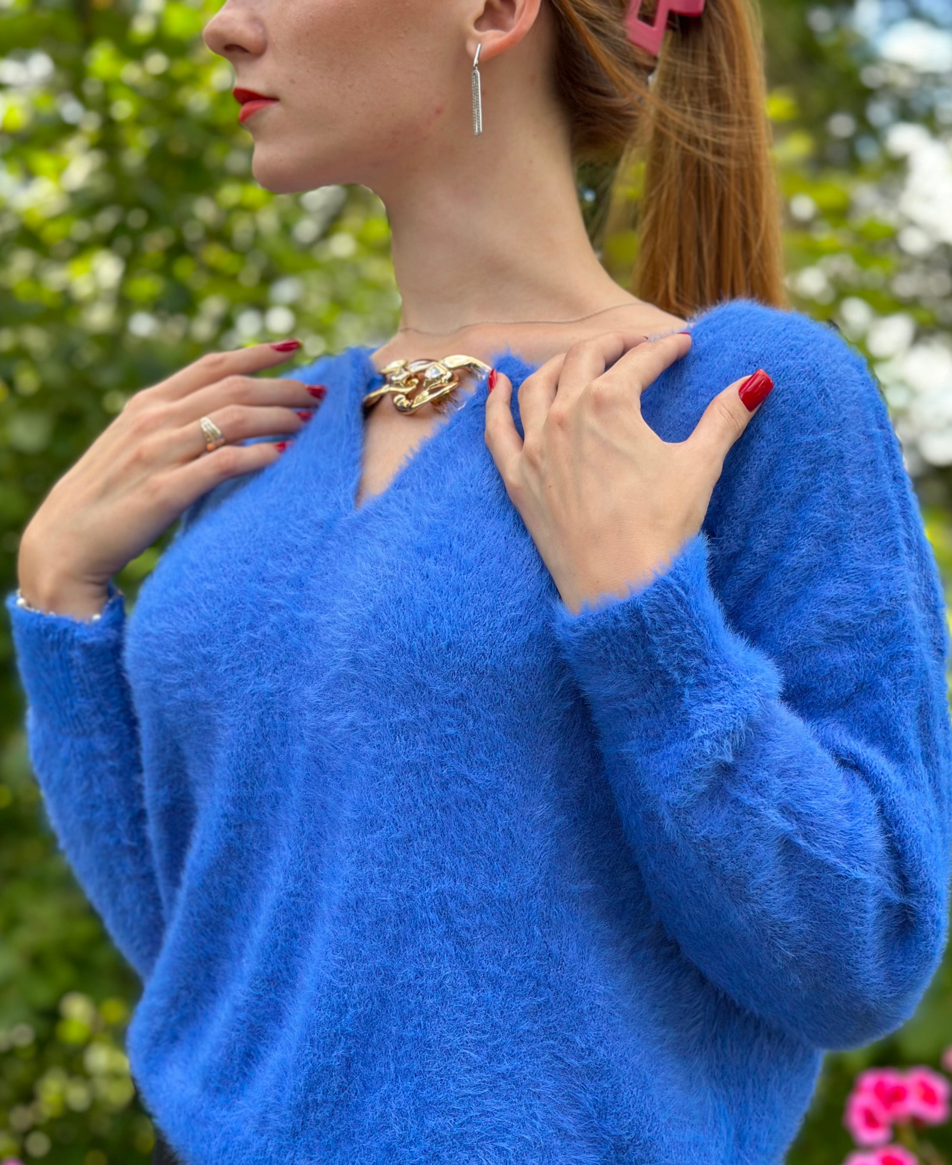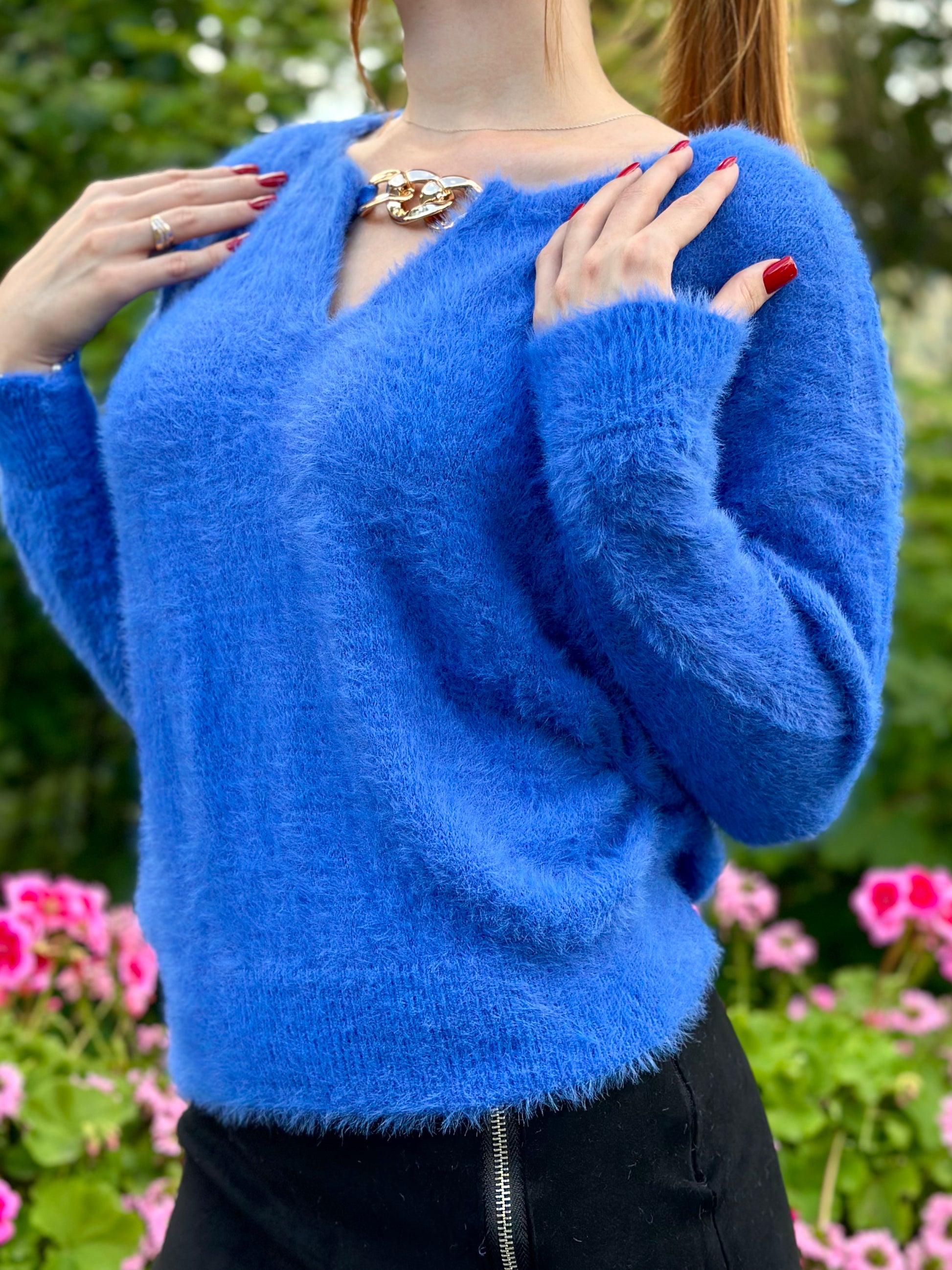 Zilais džemperis ar apkakles zelta krāsas ķēdi