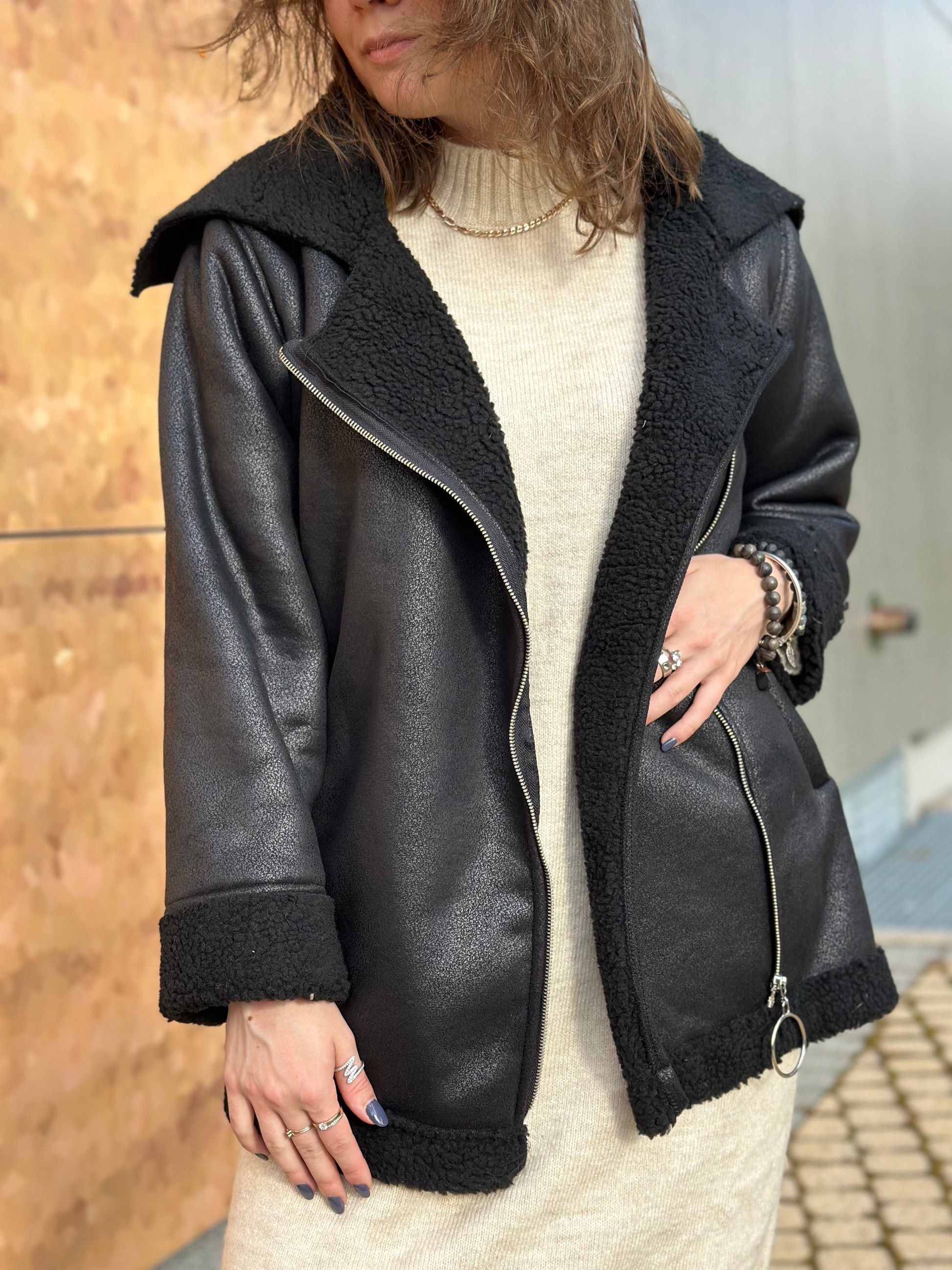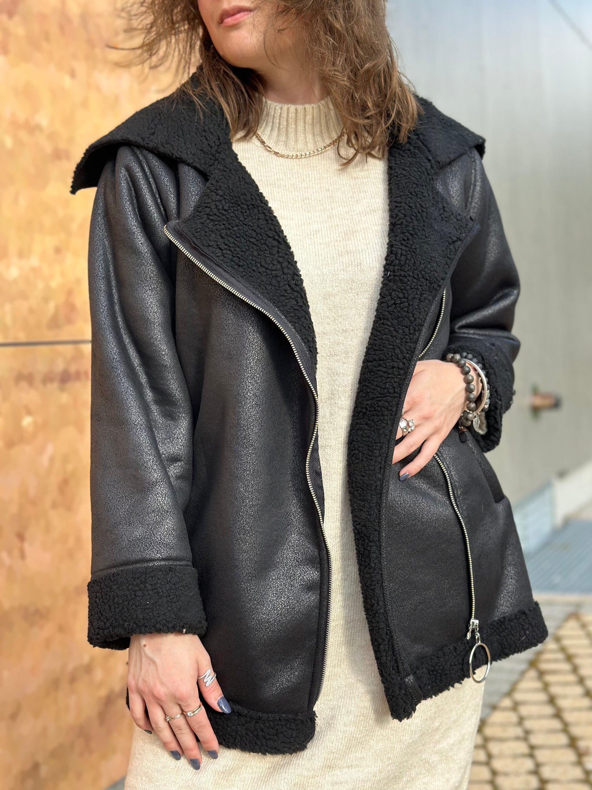 Melns ādas mētelis ar rāvējslēdzēju
